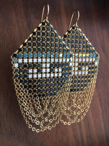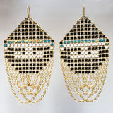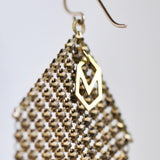 Very rare, pattern-matched mesh earrings feature hand-painted key motifs from an Art Deco Era purse. The design is taken from the corners of the bag, and only two pairs of earrings are still available. Draped with lightly swaying panels of 22 karat gold vermeil chain. Extra large Lantern Earrings measure 1.75" wide and hang 3" long including the 14k gold filled ear wires. Each earring signed with our logo link.