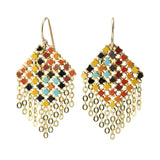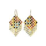 Small diamond-shaped panels of the bright, playful mesh we call Festival, hand-linked with a panel of gold shimmy fringe. Enamel mesh is reclaimed from an antique purse (circa 1920-1930s) and fringed with a skirt of 14k gold filled chain. Earrings measure just under 1" across and hang 2” long, including the 14k gold filled ear wires. Each earring signed with our logo link.