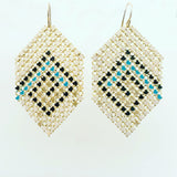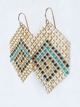 Black spirals with bright blue detail are mirrored on this special matched pair of earrings from an Art Deco era mesh purse. Originally hand painted in the 1920s, the spiral motif is rarely found on the antique bags — these earrings are a very limited edition vintage treasure. Finished with 14k gold filled hangers and ear wires. Each earring signed with our logo link.