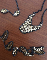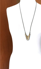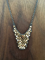 Wear a glittering swatch of history, anchored in a hand-linked frame of oxidized sterling silver chain. Large curved drop of gold plated brass mesh is up-cycled from a reclaimed vintage Whiting & Davis purse (circa 1940s-1970s.) Joinery around the mesh element is carefully welded chain-to-chain, drawing smooth, uninterrupted lines throughout the work.