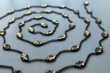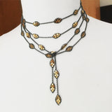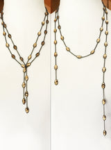 Sustainable, slow fashion - meditatively and meticulously made by hand. This versatile necklace wraps and ties in a variety of styles - it can also be worn as a bracelet or headpiece. Featuring 38 gold droplets of reclaimed, vintage metal mesh carved from a classic Whiting & Davis purse (c.1940-60), the mesh borders hand-linked in dark oxidized sterling silver chain. Instead of using bulky jump rings, all joinery around the mesh elements is carefully welded chain-to-chain, drawing an uninterrupted line throughout the work. Measures 55 inches long, droplets measure 1/2 inch.