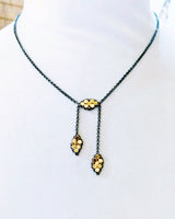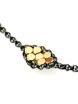 Asymmetric necklace - a dynamic form in dark sterling silver and fluid gold mesh. Vintage metal mesh drops are carved from an iconic Whiting & Davis purse (circa 1940s-1970s), the edges then hand-linked with oxidized sterling silver chain. Joinery around the mesh elements is carefully soldered/welded chain-to-chain, drawing smooth, uninterrupted lines throughout the work. Necklace measures 17" around.