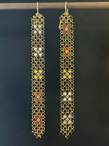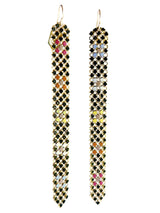 Rainbow flowers dot these slim mesh earrings made from a rare, antique, flapper purse - hand-enameled in the 1920s. Earrings measure 0.375" across and hang 4" long, including the 14k gold filled ear wires. Each signed with our logo link. New limited edition of four pairs for 2024.