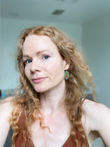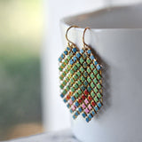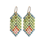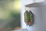Bright enamel mesh earrings feature pink roses surrounded in spring greens and framed in blue. Gold plated brass mesh is reclaimed from an antique flapper purse (circa 1920-1930s) and suspended from 14k gold filled hangers. Earrings measure .75" wide and hang 1.4” long, including the ear wires. Each signed with our logo link.