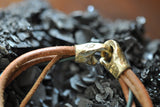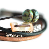 Multi-strand bracelet of natural leather cording wrapped with earthy vintage treasures. Whiting & Davis silver Beadlite stud mesh (c.1950), turquoise (c.1970), abalone button (c.1970).