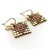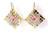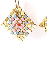 Petit Four Earrings in pastel pink + blue mesh with a red accent, hand pieced with a gold mesh frame. Colorful enamel mesh is reclaimed from an antique purse (circa 1920-30s), gold mesh reclaimed from a vintage purse (circa 1960s-80s.) Earrings measure 1.25" long x 1" wide. 14 karat gold filled details and ear wires. Each earring signed with our logo link.