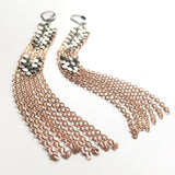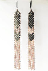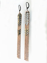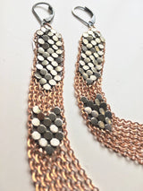 Long sweeping columns of matte oxidized silver mesh woven together with panels of 22 karat rose gold vermeil chain fringe. Bright silver mesh is buffed to a matte finish and oxidized to medium grey.