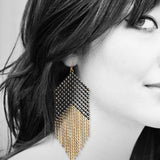 Original enamel metal mesh is culled from a mid-century vintage purse featuring mini-stud 3-D links (circa 1930-50s), then we hand-burnished the painted tips to reveal a bright hit of the underlying brass. Fringed with a graduated panel of 14K gold filled chain.
